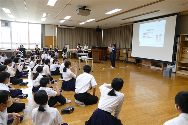 外部から講師の先生をお招きして、手話の意味やその必要性や大切さを説明していただきました。そして、実際に、1年生全体で手話の練習をしました。